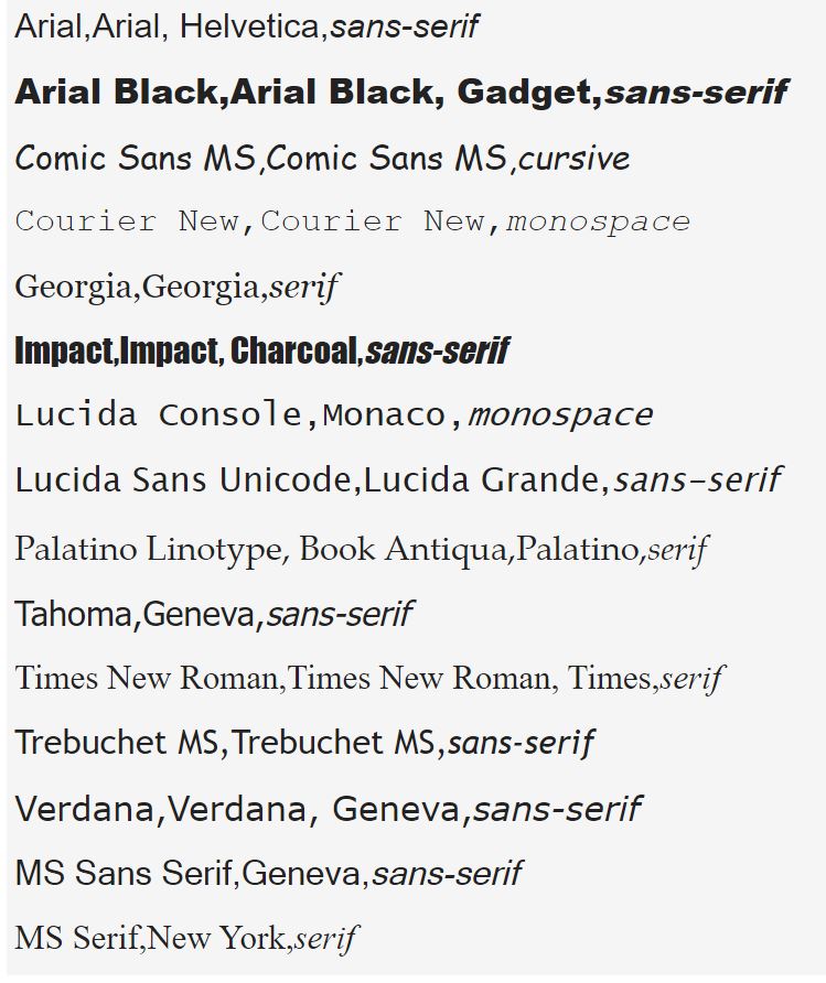 Presentamos una lista con los tipos de letra considerados “fuentes seguras para la web”. Estas fuentes son mostradas correctamente en todos los navegadores, sin importar la versión de Windows o Mac.